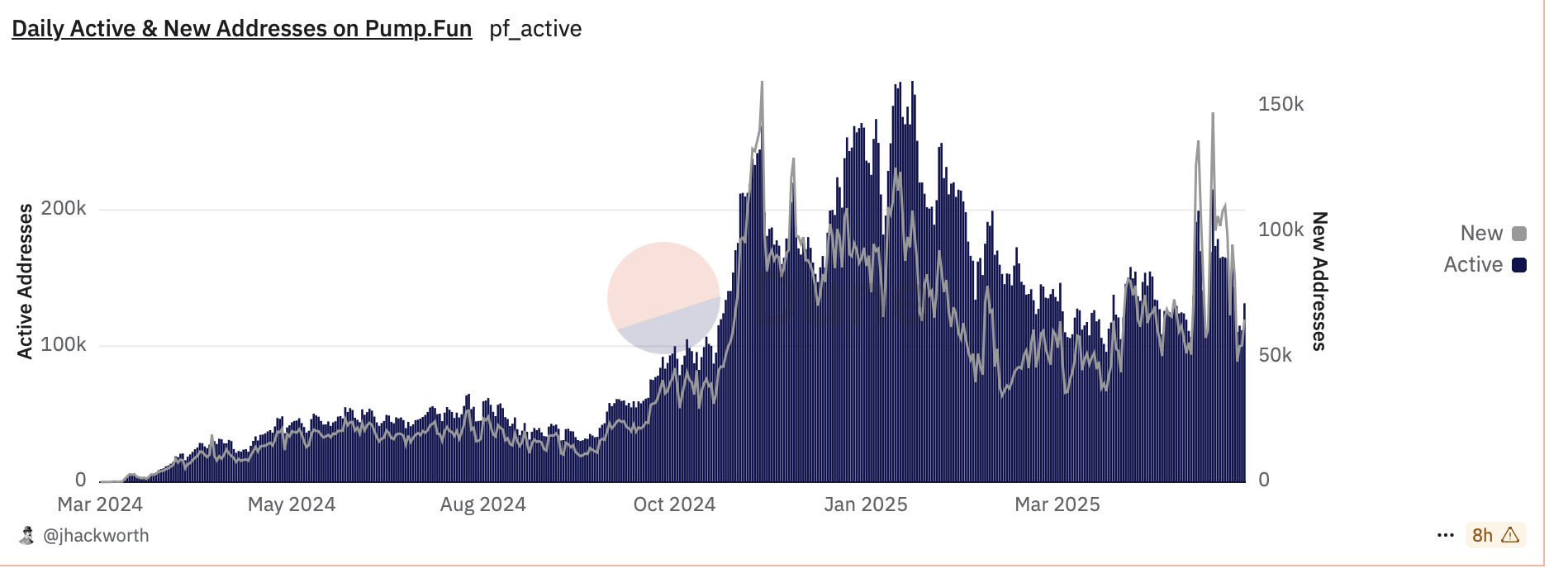 Même si Pump.fun est de retour, les indicateurs fondamentaux montrent un net ralentissement de son activité. Selon Dune Analytics, le nombre d’adresses actives quotidiennement a chuté de plus de moitié depuis janvier, passant de 150 000 à environ 50 000 en juin. Cette baisse s’explique à la fois par la baisse structurelle des meme coins depuis le scandale Libra mais aussi par un secteur trop saturé où les nouveaux projets n’arrivent plus à séduire les investisseurs.