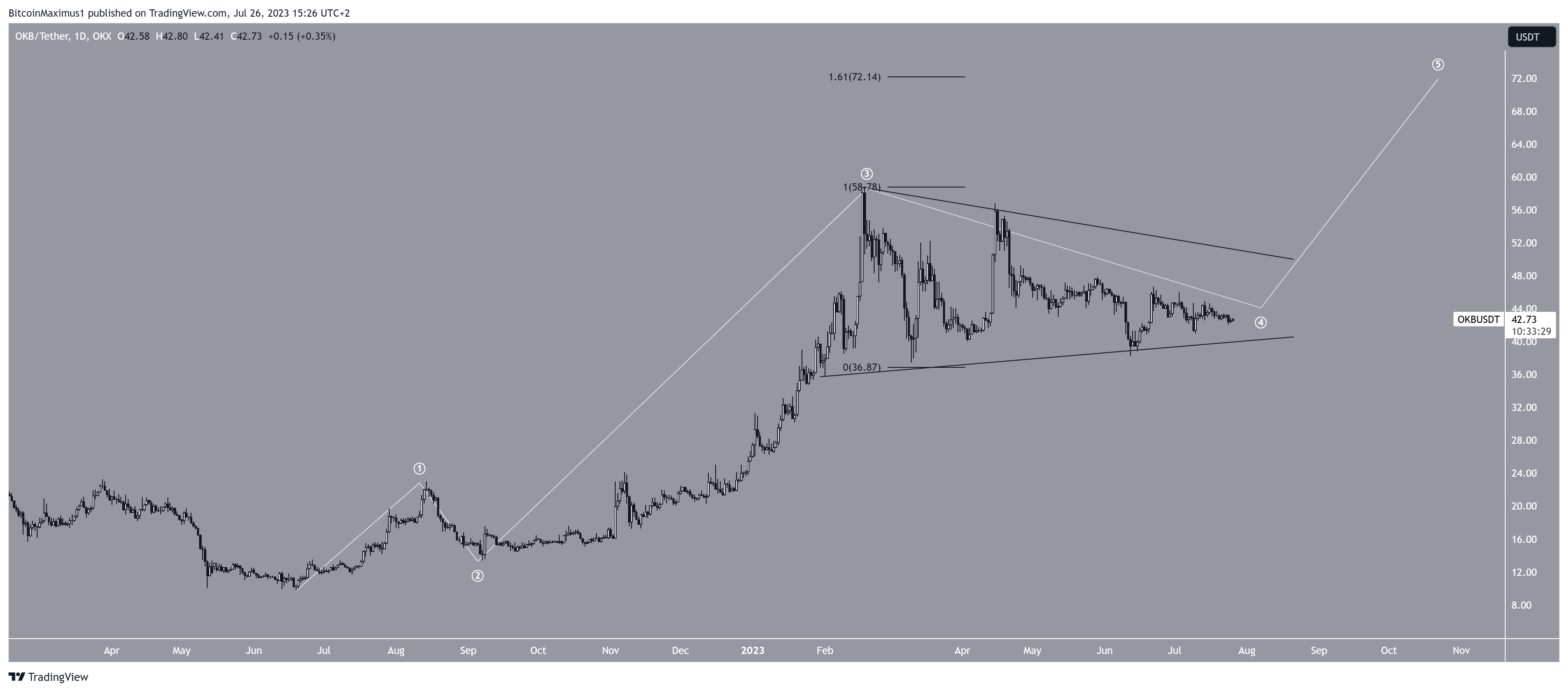 La présence d’un triangle symétrique dans cette éventuelle quatrième vague ainsi que la forme de la vague actuelle soutiennent ce décompte. Si cette interprétation est correcte, le cours OKB devrait sortir du triangle et s’envoler. Ce, vers un niveau de résistance à 72,10 $. Cette hausse permettrait au jeton de l’exchange crypto OKX d’établir un nouvel ATH. Finalement, OKB est un des principaux altcoins à surveiller pour août.