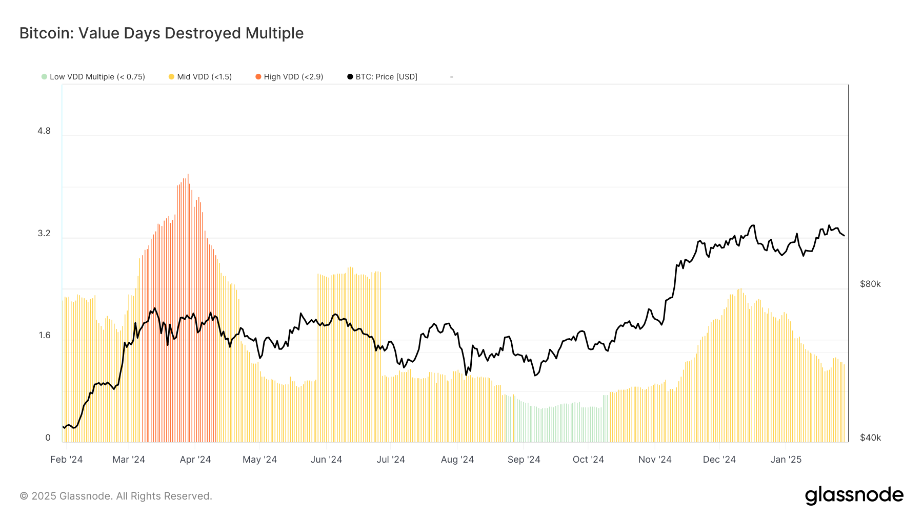 L’indicateur du Multiple des Jours de Valeur Détruits (VDDM de l’anglais Value Days Destroyed Multiple) est un indicateur crucial lorsqu’il s’agit de suivre les tendances du marché de Bitcoin. Il permet de comparer les dépenses à court terme aux moyennes annuelles, des valeurs élevées (au-dessus de 1,4) indiquant un marché en surchauffe. Ainsi, des valeurs extrêmes (au-dessus de 2,9) ont précédemment marqué les sommets des cycles, signalant alors de potentielles corrections à venir pour le cours de Bitcoin.