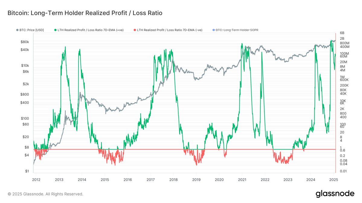 Les volumes de profit et de perte des détenteurs à long terme de Bitcoin offrent également un aperçu clé de la dynamique du marché. En effet, le ratio entre ces deux indicateurs reste considérablement élevé, indiquant que la plupart des LTH sont en profit. Ce schéma s’avère caractéristique des phases de marché haussier, où une offre minimale est détenue à perte, renforçant la tendance d’accumulation en cours.