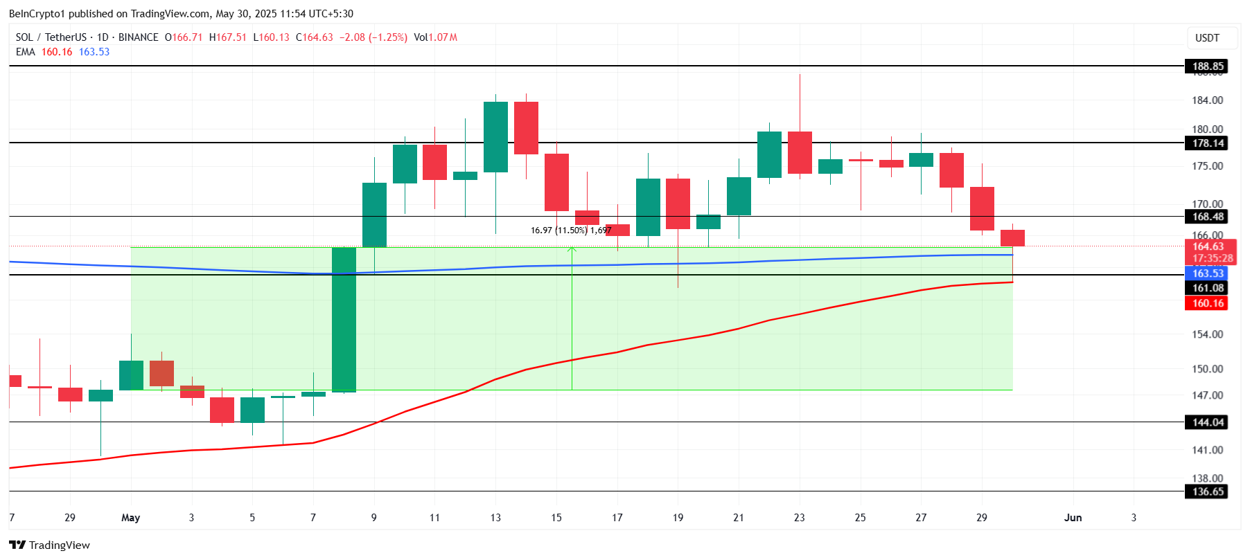 Au moment de la rédaction, le cours de Solana s’élève à 164 dollars, marquant une augmentation de 11,5 % depuis le début du mois de mai, mais une baisse de 12 % par rapport au sommet du mois. Compte tenu des signaux mitigés provenant à la fois des flux institutionnels et de l’accumulation par les particuliers, le cours de Solana devrait rester dans une fourchette limitée en juin. Il continuera probablement à osciller entre le support à 161 dollars et la résistance à 178 dollars, avec des niveaux clés qui nécessiteraient une forte impulsion de l’ensemble du marché pour une percée haussière.