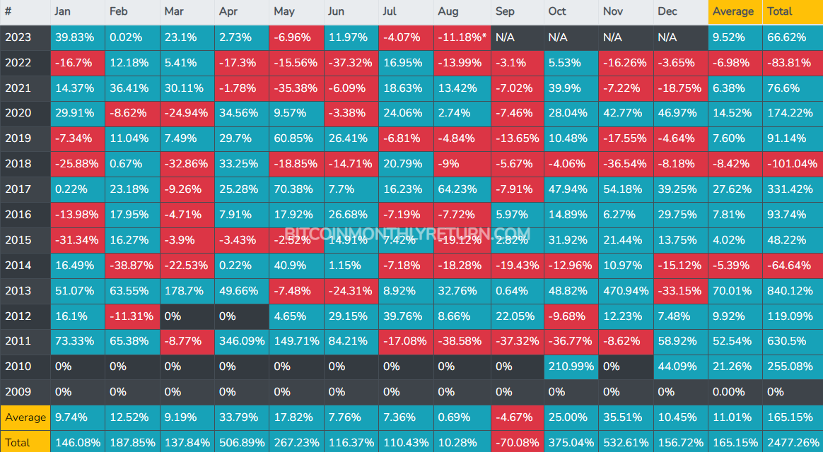 Comme le montre le tableau ci-dessous, la crypto de 👤 Satoshi Nakamoto est rarement dans sa meilleure forme pendant le mois de septembre. Bien que le mois d’août 2023 ne soit pas encore terminé, le cours Bitcoin a déjà dégringolé d’environ 11 % par rapport au dernier jour de juillet.