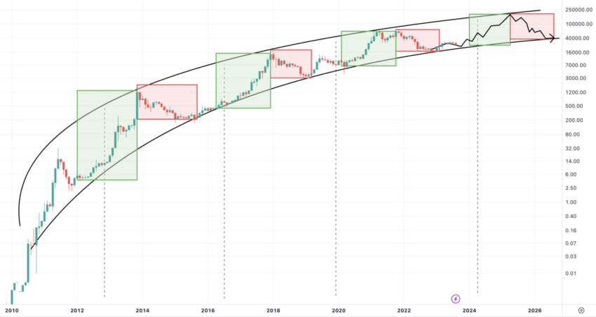 Les lignes pointillées du graphique représentent les événements de halving, tandis que les carrés verts représentent les hausses de prix qui ont été enregistrées en 2013, 2017 et 2021. Le graphique comprend également une projection spéculative pour 2025.