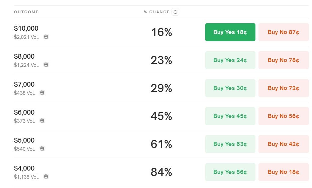 Cependant, pour l’année 2025 dans son ensemble, on ressent un optimisme beaucoup plus prononcé. Les parieurs de Polymarket sont majoritaires à espérer un prix supérieur à 4 000 $ et 5 000 $ pour cette nouvelle année. Si le sentiment positif pourrait encore se renforcer à l’avenir, pour le moment, il est difficile d’aller voir plus haut.