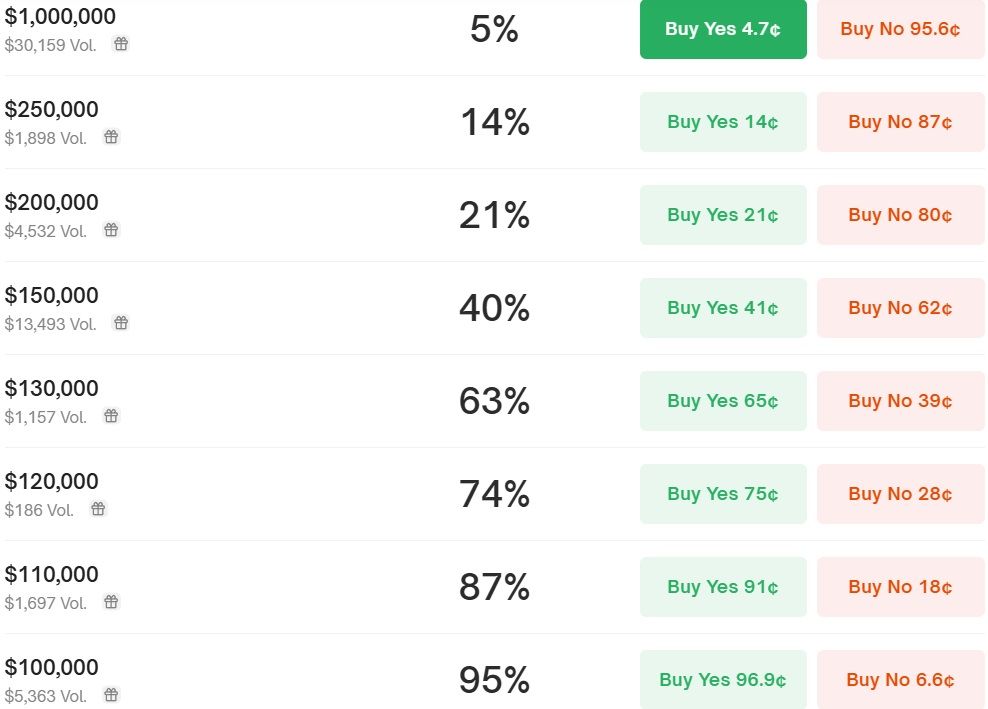 Si les prédictions nous ont annoncé une très large variété de prix, voici l’avis des parieurs de Polymarket. Pour rappel, ces derniers ne mettent pas seulement à contribution leur conviction mais aussi leur argent. Actuellement, ces parieurs sont plutôt optimistes en ce premier janvier 2025 en espérant une hausse des prix du Bitcoin.