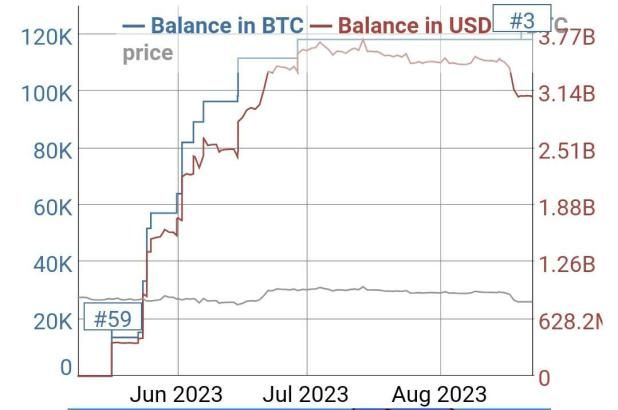 Au total, le mystérieux portefeuille a accumulé près de 3,08 milliards de dollars pour un total de 118 300 ₿ BTC. Globalement, l’accumulation a rapidement progressé jusqu’à la fin du mois de juillet avant de s’interrompre sur ce mois d’août. Ce, alors même que le cours du Bitcoin s’est abaissé sur la période.
