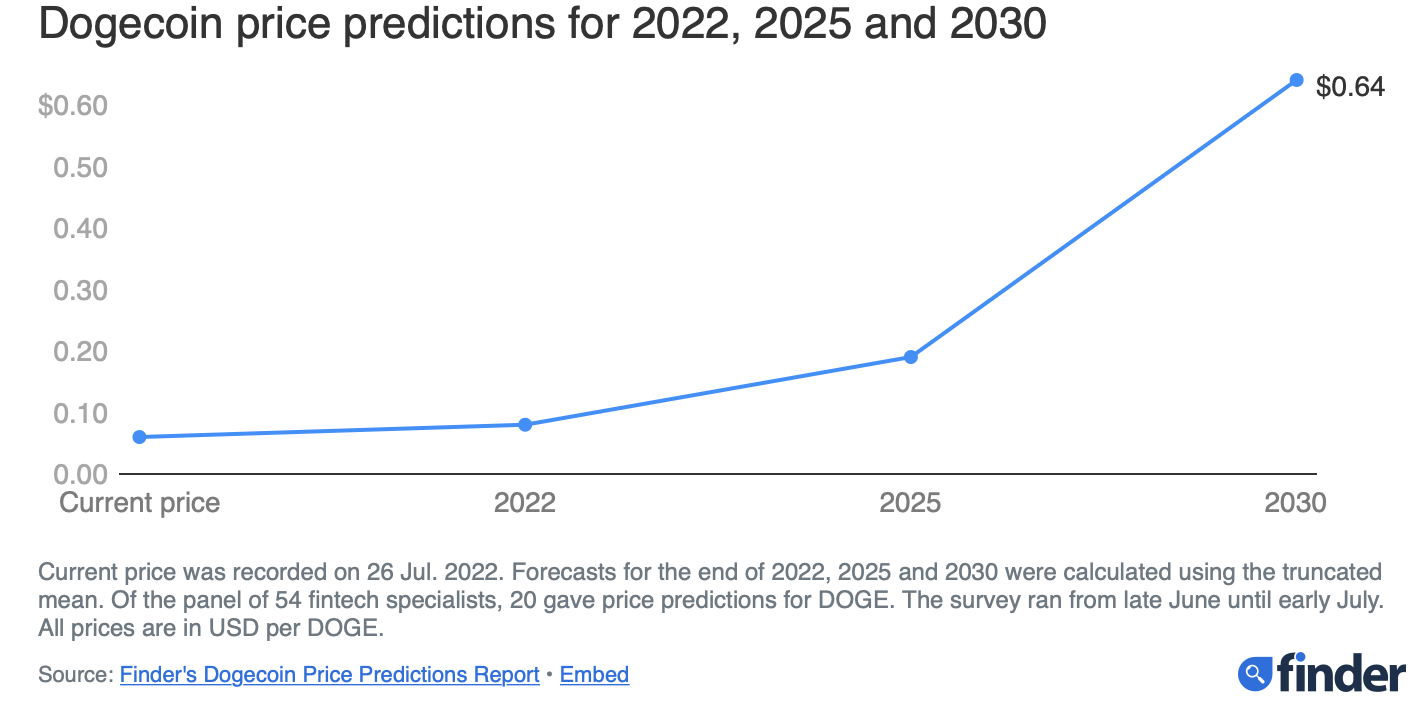 Selon des chercheurs de Finder, il y a de très faibles chances de que le cours du Dogecoin atteigne 1 $ à la fin de l’année. Pour ces derniers, un niveau technique réalisable pour le Dogecoin serait une hausse vers les 0,08 $.