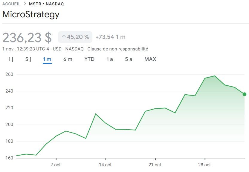 Parmi les “rivaux”, c’est MicroStrategy qui fait mieux que tout le monde, avec une performance record sur le mois d’octobre. La hausse est impressionnante, tout aussi impressionnante que le prix d’échange actuel de chaque action. En effet, puisque le MSTR s’est revalorisé de 44,61 % depuis le 1er octobre. L’actif est passé d’un prix d’échange de 162,69 $ à un prix de 236,23 $. Sur ce laps de temps, un prix maximum a même été fixé à 266,32 $.