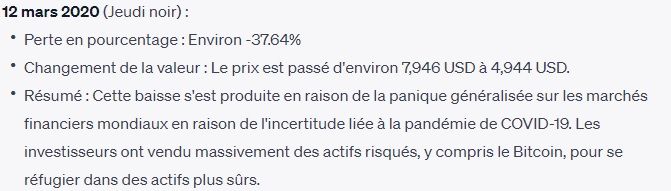 C’est notamment ce qui s’est passé en 2020, une année qui nous parle sans doute, aujourd’hui encore. En effet, puisque en 2020 a fait son apparition un épisode troublant de l’histoire de l’humanité. A cause des incertitudes liées au Covid-19, le cours du Bitcoin a connu une journée dévastatrice le 12 mars 2020. Cet épisode tumultueux a également été partagé par l’ensemble des marchés financiers