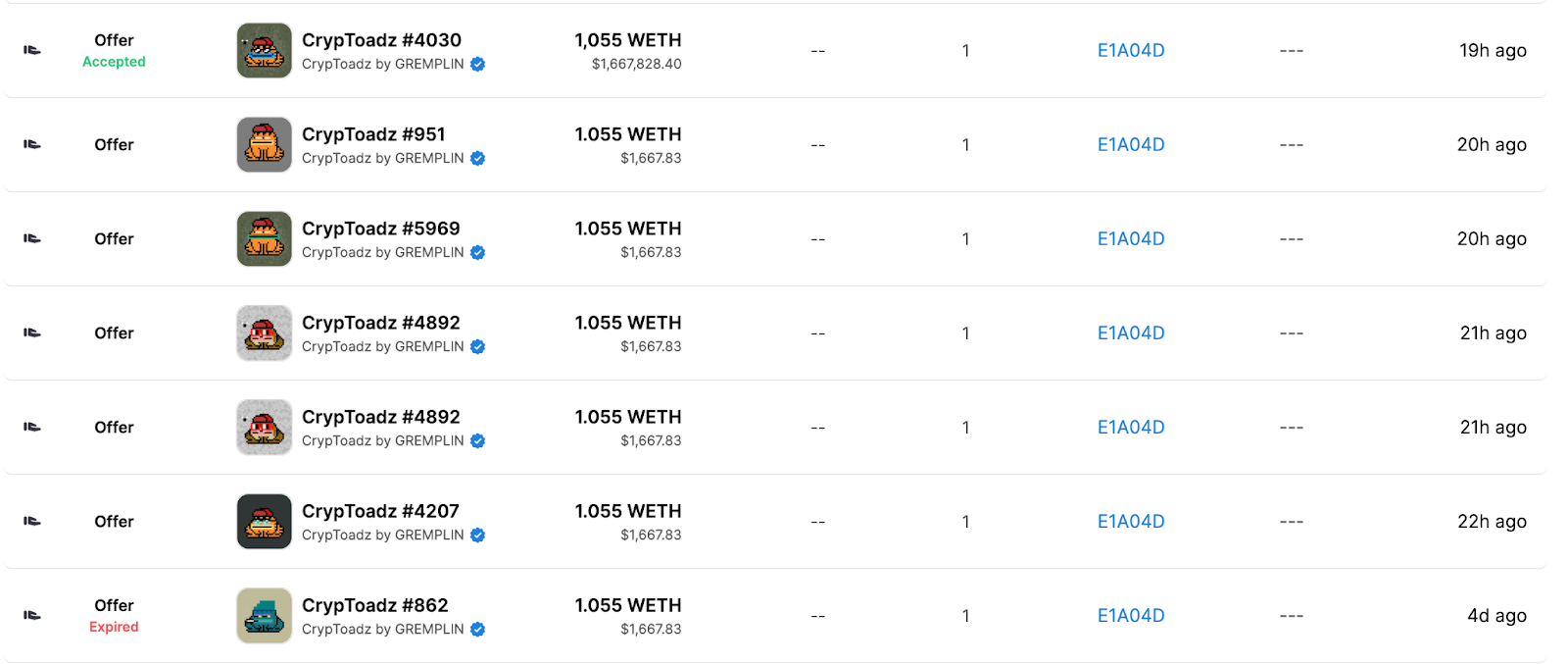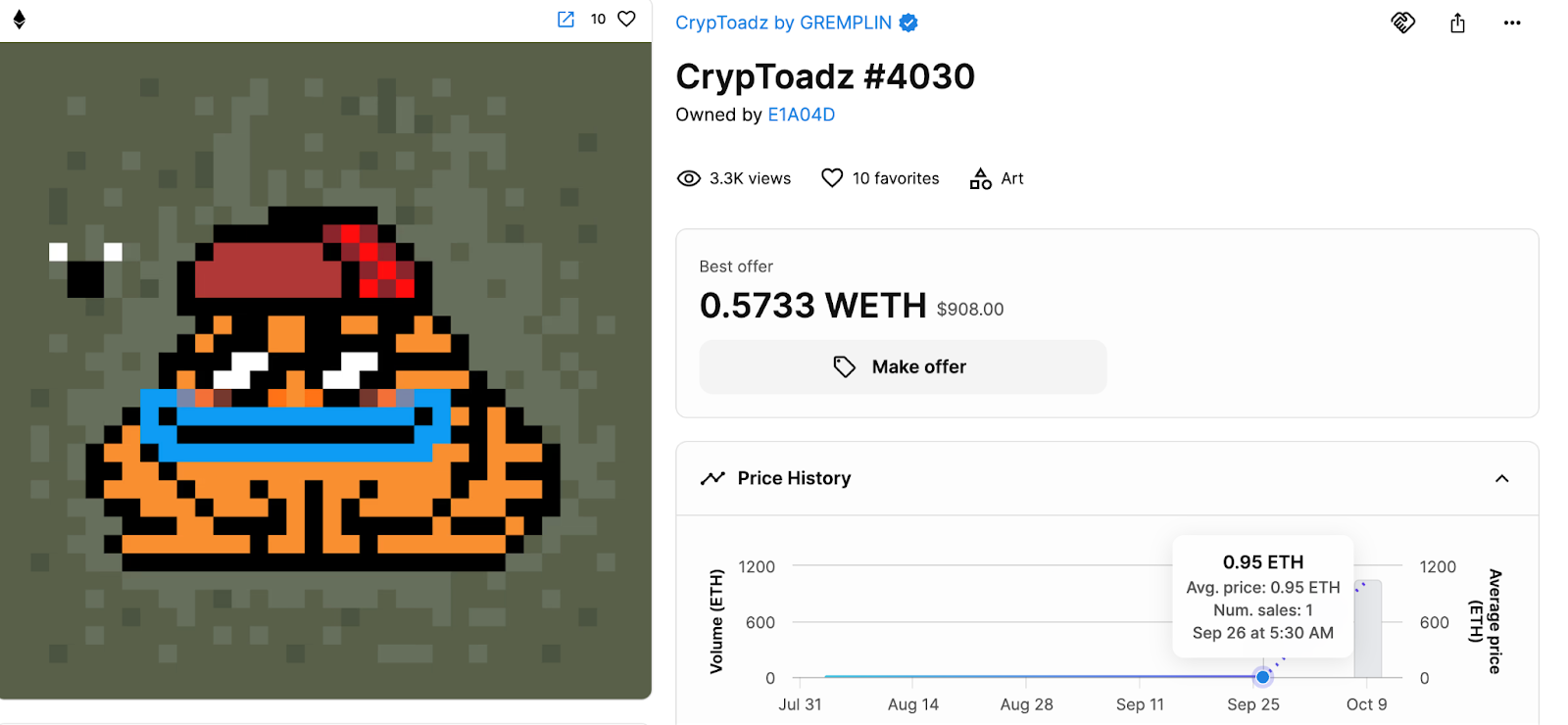 Les données d’OpenSea montrent qu’un portefeuille, 0xe1a0, a acheté le NFT CrypToadz #4030 pour 1 055 WETH (environ 1,4 million de dollars) le 9 octobre. La transaction a attiré l’attention de la communauté parce que le prix moyen de ce NFT est resté aux alentours de 0,95 ETH. Cependant, 0xe1a0 a payé plus de 1 000 fois plus le prix moyen de l’actif.