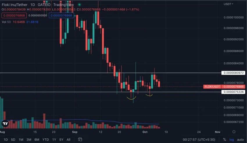En juin 2022, Floki Inu est tombé à un creux de près de 0,0000048433 $. Il a ensuite grimpé de 270 % pour atteindre un nouveau sommet local d’environ 0,0000178931 $. Plus tard, le token a formé un double sommet, avant de passer sous le niveau de résistance de 0,0000135356 $. Dès lors, le token a progressivement dégringolé, perdant près de 55% par rapport à son sommet d’août.