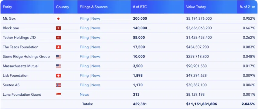 En ce qui concerne les entreprises privées, l’exchange déchu Mt. Gox arrive en tête de liste. Néanmoins, les 200 000 BTC (soit 0,95 % de l’offre en circulation) qu’il détient appartiennent à ses créanciers.