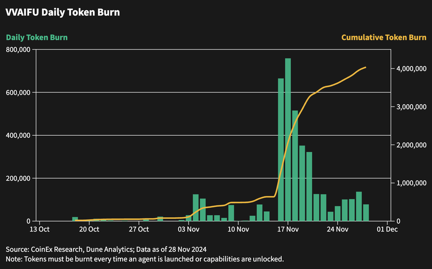 L’intégration de l’IA, des cryptomonnaies et du l’univers meme a conduit à des innovations dans les Agents AI Autonomes, comme en témoignent Truth Terminal et Goatseus Maximus. Ces agents disposent de capacités avancées telles que l’engagement sur les réseaux sociaux et la prise de décisions autonomes. Un facteur clé est Eliza, en open source et contribué par ai16z, qui est devenu l’un des projets les plus en vogue sur GitHub. S’appuyant sur cette base, VVAIFU exploite cette technologie pour offrir aux utilisateurs une plateforme de création d’Agents AI personnalisés et le lancement de memecoin à travers l’écosystème PumpFun. Le succès de la plateforme est visible à travers son mécanisme de brûlage de tokens, avec plus de 4 millions de tokens brûlés depuis son lancement.