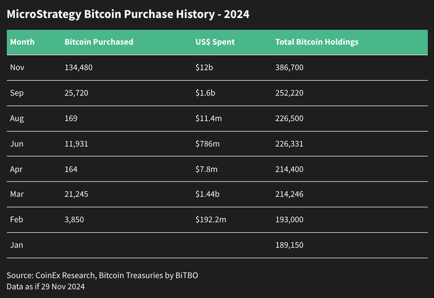 En novembre, le soutien institutionnel était évident, avec des entrées de fonds record de 6,1 milliards de dollars dans les ETFs Bitcoin spot, le chiffre mensuel le plus élevé à ce jour, et MicroStrategy accumulant 134 480 BTC équivalant à un coût moyen d’environ 12 milliards de dollars, renforçant sa domination sur le marché et soutenant davantage la dynamique haussière des prix.