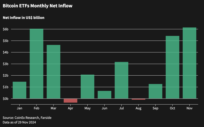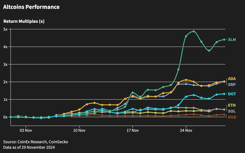 Bitcoin est passé d’une ouverture mensuelle à 70 300 $ à un record de 99 500 $, approchant la barre symbolique des 100 000 $. La victoire de Trump a suscité de l’optimisme, notamment car ses politiques laissent entrevoir des réformes réglementaires possibles, y compris le remplacement du président de la SEC et des discussions sur la constitution d’une réserve stratégique de Bitcoin.