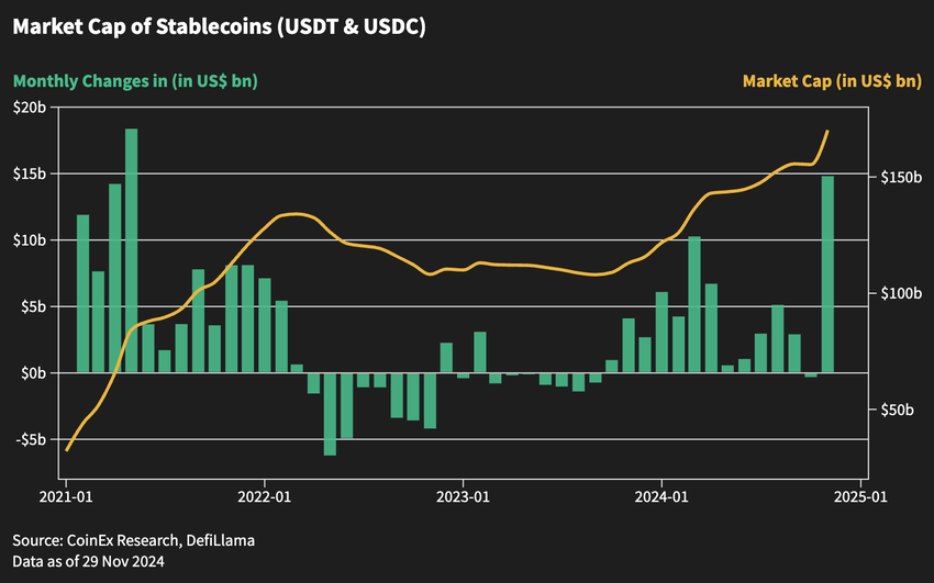 Le mois de novembre a également été le témoin d’une croissance explosive de l’émission de stablecoins, avec une augmentation de 14 milliards de dollars, atteignant le niveau vu pour la dernière fois en avril 2021, reflétant une abondance de liquidité sur le marché. Cette montée en flèche est parallèle à la trajectoire haussière du marché et laisse présager une croissance soutenue dans le cycle à venir.