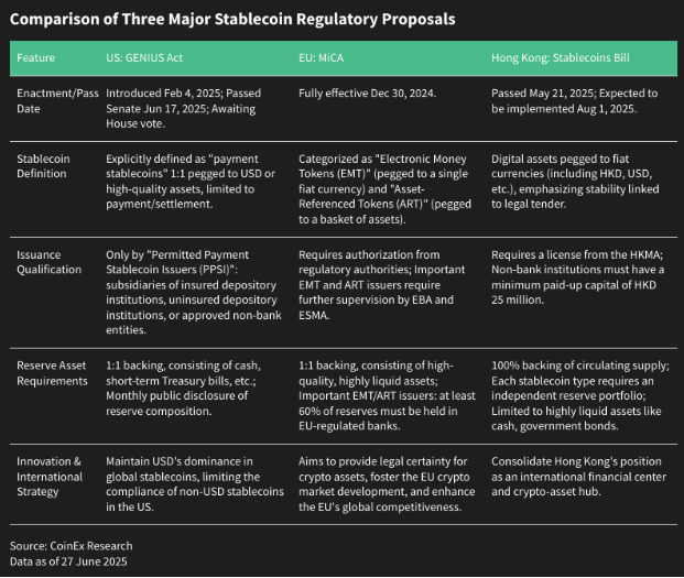 Au niveau mondial, le paysage des stablecoins évolue rapidement sous une vague de clarté réglementaire et de réforme de la conformité. L’Union européenne a ouvert la voie en mettant pleinement en œuvre son cadre Markets in Crypto-Assets (MiCA) le 30 décembre 2024. Parallèlement, Hong Kong a introduit son propre régime réglementaire pour les stablecoins le 21 mai 2025, alignant la politique locale sur les normes internationales.