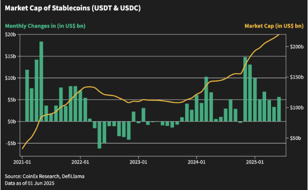 Selon le rapport de CoinEx Research, le mois de juin a été un mois de volatilité et de résilience pour Bitcoin, qui a chuté en raison des tensions accrues au Moyen-Orient mais a rebondi en fin de mois avec l’atténuation des risques géopolitiques. Pendant ce temps, l’introduction en bourse historique de Circle a signalé une confiance croissante dans la maturité du marché des capitaux de la crypto. Les Actifs du Monde Réel (RWA) ont poursuivi leur forte hausse, soutenus par des avancées réglementaires aux États-Unis, en Europe et en Asie. L’émission de stablecoins est revenue à 5 milliards de dollars, préservant les bases haussières du marché malgré les vents contraires macroéconomiques. Ensemble, ces événements indiquent un paysage d’actifs numériques qui évolue rapidement de la spéculation vers une adoption à l’échelle institutionnelle.