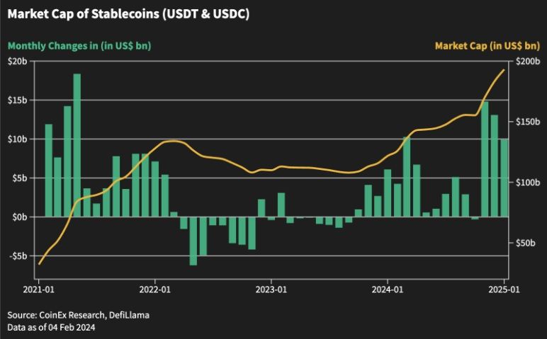 Les stablecoins ont continué leur progression avec près de 10 milliards de dollars d’entrées sur le marché crypto en janvier. Cela a maintenu une tendance déjà observée lors des mois précédents avec toujours plus d’afflux de capitaux.