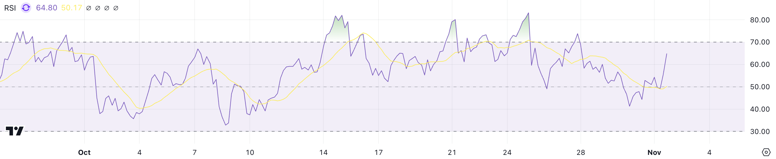 Le cours du RAY a augmenté de 18,51 % cette semaine. Malgré cela, son RSI est actuellement qu’à 64,8, toujours en dessous du seuil de surachat. Le RSI, ou indice de force relative, mesure la vitesse et l’ampleur des changements de cours récents. Ce, afin d’évaluer les conditions potentielles de surachat ou de survente.