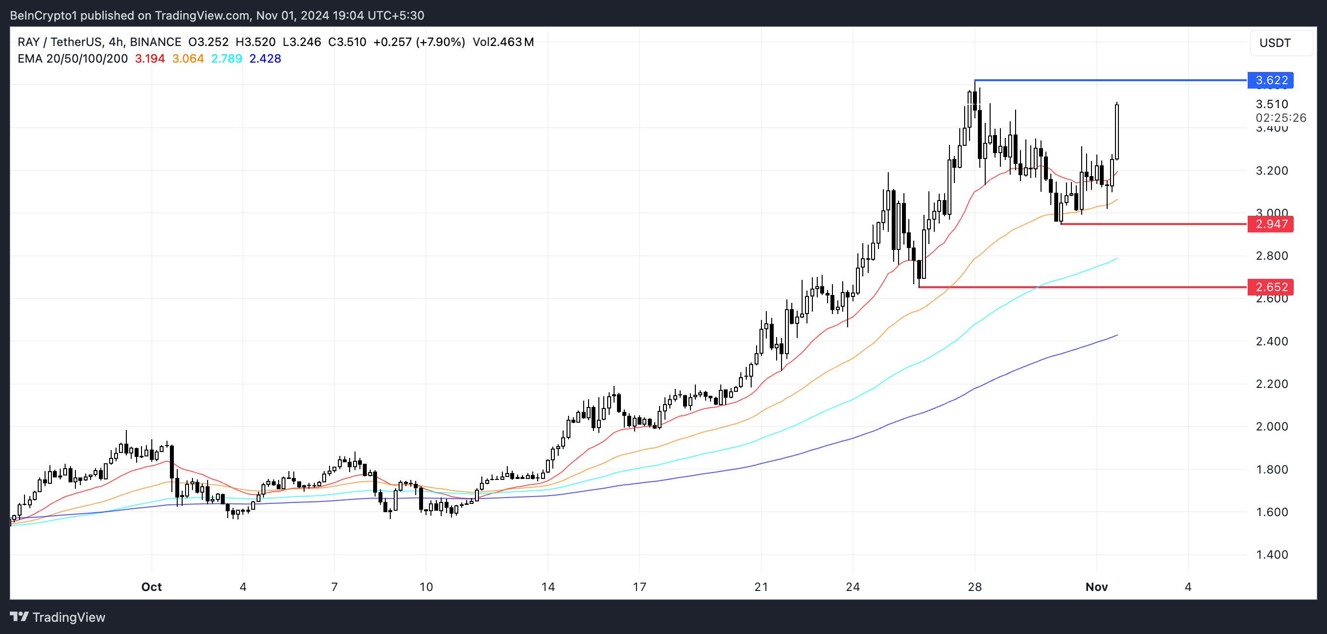 Tout cela suggère un élan ascendant fort, avec les acheteurs qui maintiennent le contrôle à court terme. Si cette tendance haussière se maintient et que le RSI reste sous le seuil de surachat, le jeton de Raydium pourrait dépasser les 3,62 $, marquant son cours le plus élevé depuis 2022.