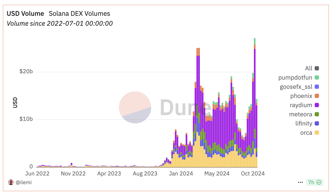Par exemple, lors de la semaine du 28 octobre, le volume des DEX de Solana a atteint 14,3 milliards de dollars. Raydium a à lui seul contribué à hauteur de 8,9 milliards de dollars, soit 62 % du total.