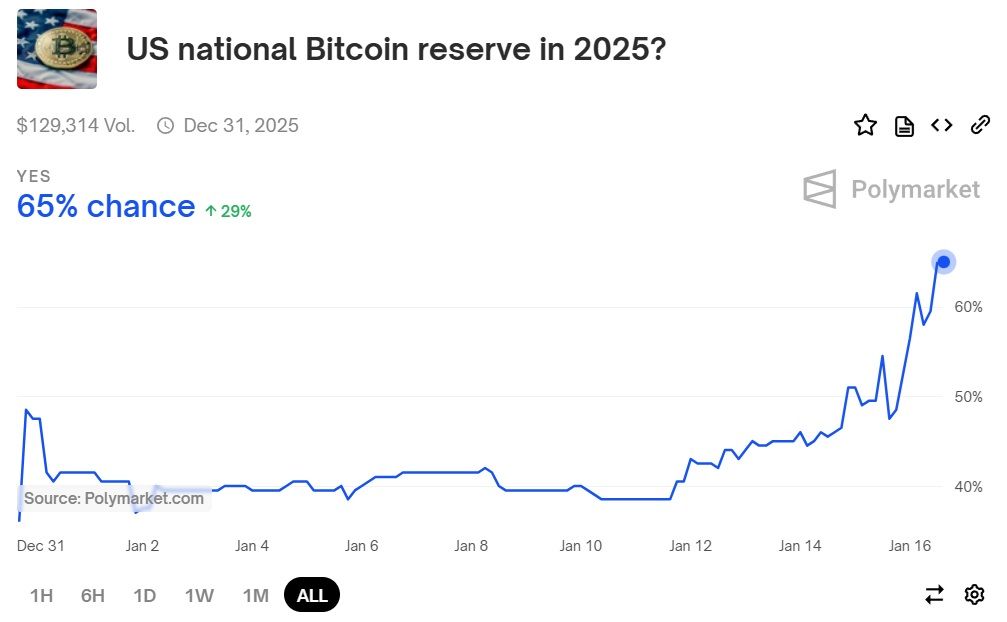 Si l’on évalue la mise en place d’une réserve Bitcoin sur toute l’année 2025, les probabilités augmentent considérablement, avec un score actuel de 65 %. L’évolution des probabilités est de plus en plus positive au fil des journées et ce, depuis le lancement de ce pari. Les parieurs de Polymarket font désormais état d’une très grande confiance.