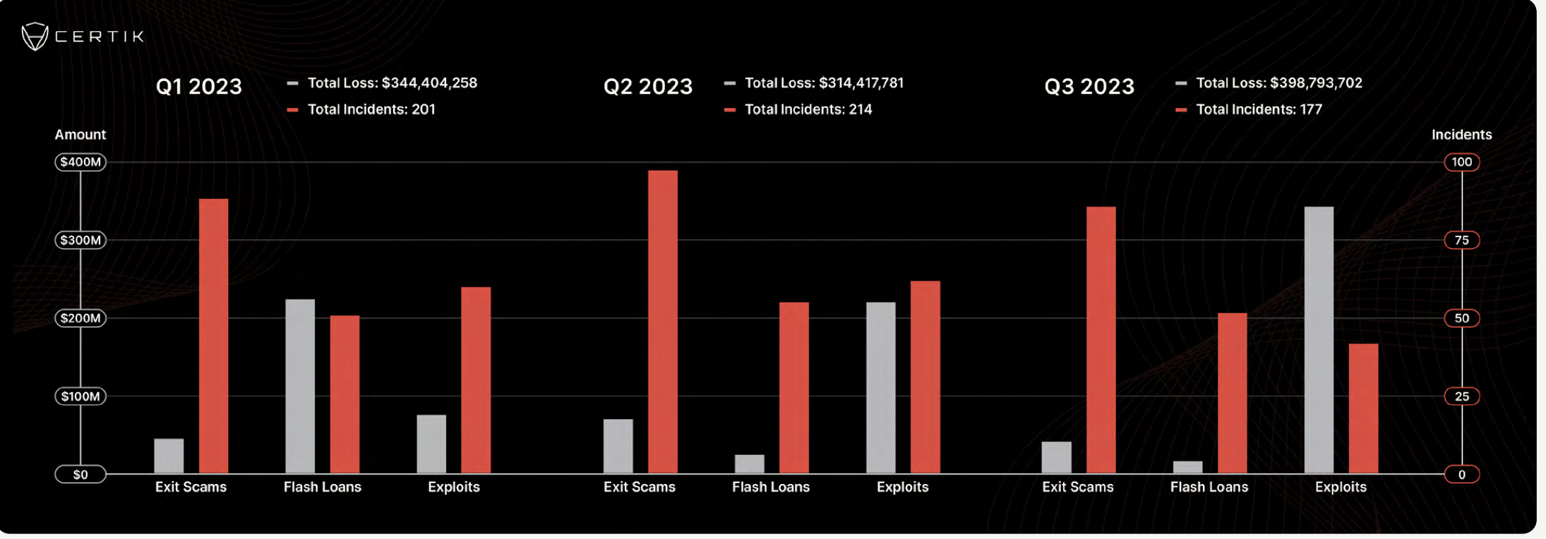 SponsoredPlus précisément, un récent rapport de Certik a révélé que les hackers ont réussi à dérober près de 700 millions de dollars aux protocoles de l’industrie des cryptos. Entre juillet et septembre, Certik a ainsi recensé pas moins de 184 incidents de sécurité, entraînant des pertes de l’ordre de 699 millions de dollars. Il s’agit là d’une considérable hausse par rapport aux deux premiers trimestres de l’année, où les pertes s’élevaient respectivement à 344 millions et 314 millions de dollars, marquant ainsi une augmentation de plus de 100 % des attaques dans le domaine des cryptomonnaies.
