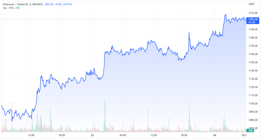 Ethereum a commencé à connaître une certaine dynamique haussière avec un bond de 10 % pour dépasser 1 200 $ au cours des dernières 24 heures.