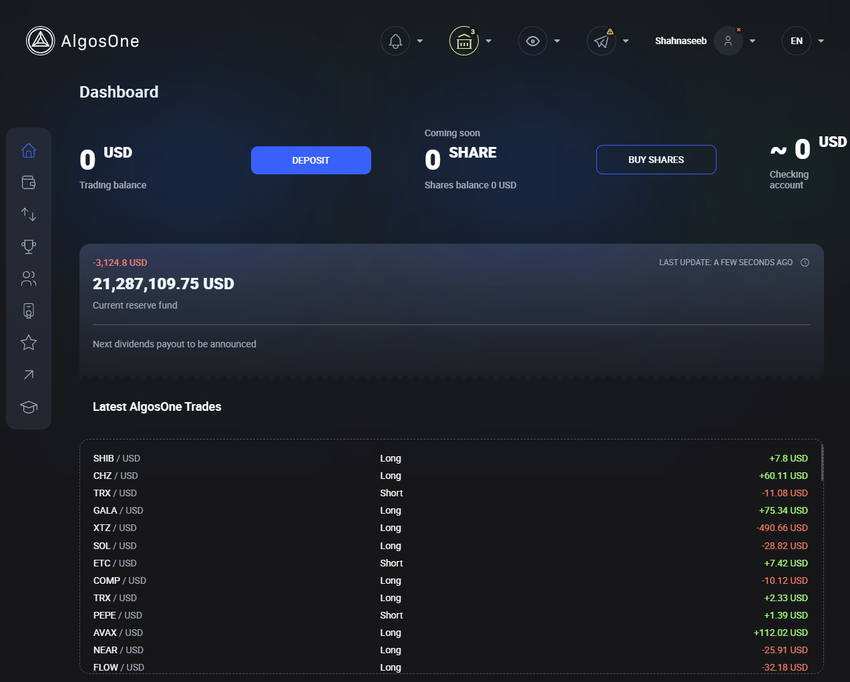 Le tableau de bord principal d’AlgosOne affiche votre solde de trading ainsi que le solde de votre compte courant principal. Il affiche également le montant actuel du fonds de réserve d’AlgosOne, lequel vise à servir de garantie en cas de situation de crise. Les utilisateurs peuvent également y consulter les dernières transactions exécutées par AlgosOne en temps réel.