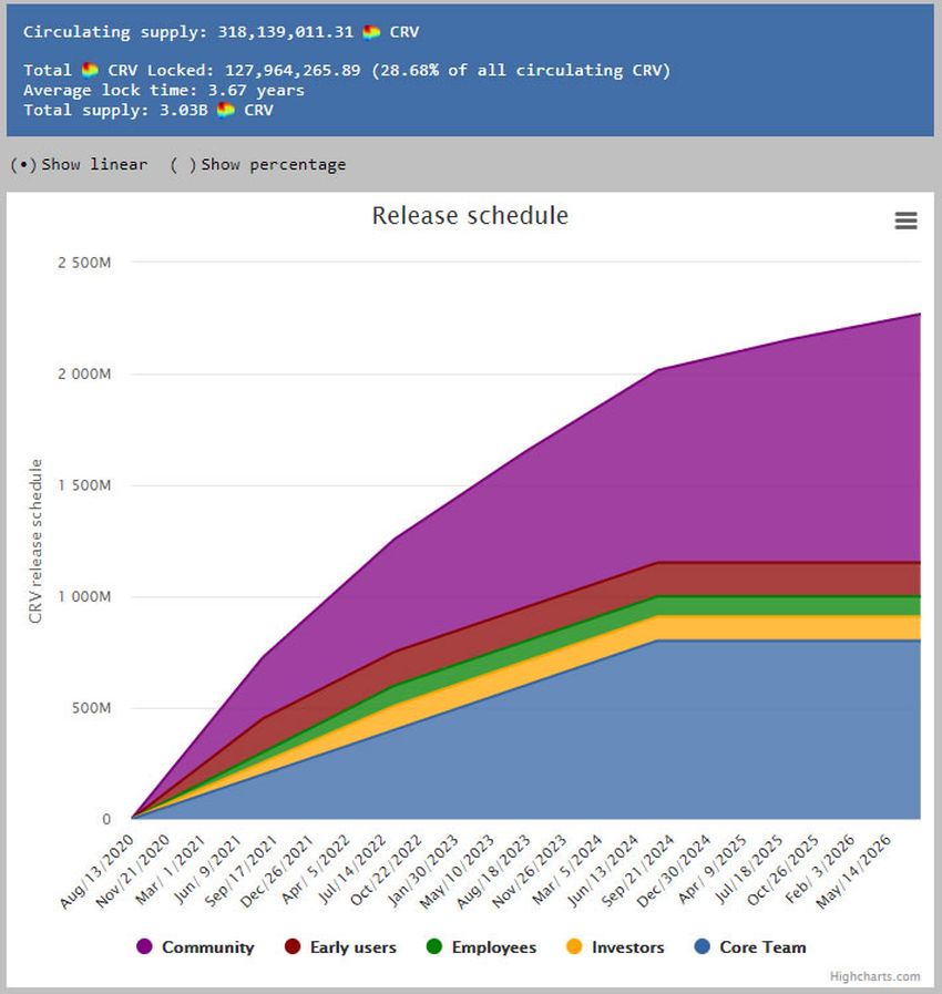 Au moment de la rédaction de cette revue, la plateforme Curve DAO a rapporté un approvisionnement en circulation de 318 millions de CRV avec 128 millions de tokens CRV verrouillés. Cela représente un total de 455 millions déjà produits, soit environ 15% du total.