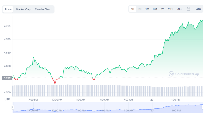 Enfin, PancakeSwap (CAKE) s’échange actuellement dans la fourchette de 4,50 $. Au moment de la mise en page de cet article, le prix du CAKE est de 4,49 $.