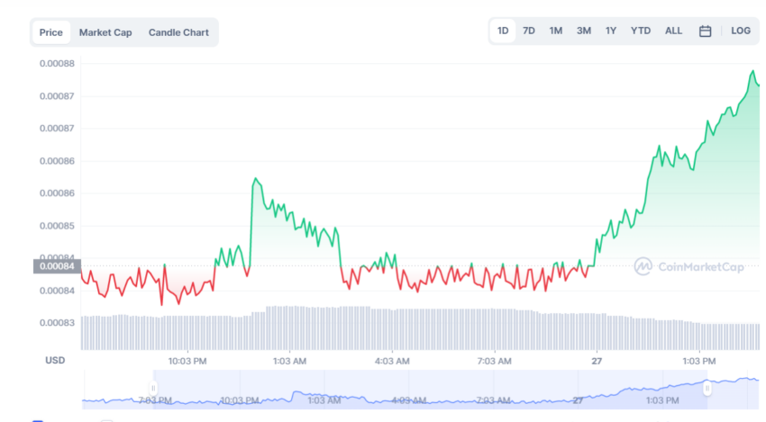 Le cours de RichQUACK a enregistré de légers gains au cours des derniers jours. Au moment de la mise en page de cet article, selon les données de CoinMarketCap, la crypto-monnaie mème se négocie à 0,00000000078 $, affichant une hausse de 2 % en l’espace de 24 heures.
