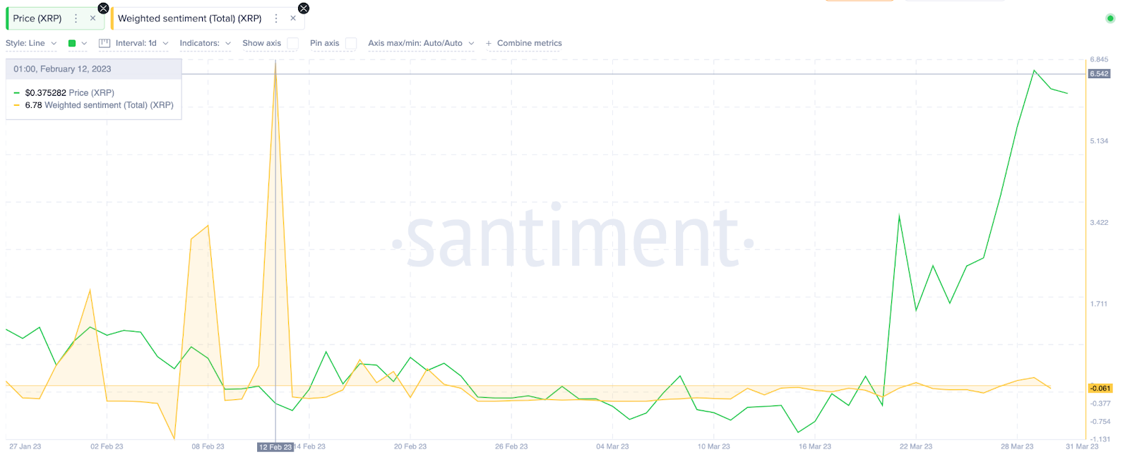 Selon la plateforme d’analyse blockchain Santiment, la perception générale autour du XRP est encore majoritairement négative. Le graphique ci-dessous illustre la tendance négative du sentiment pondéré à l’égard du XRP depuis son récent sommet de 6,78 atteint le 12 février. Au 31 mars, il reste ainsi dans la zone négative avec un score de -0,60.