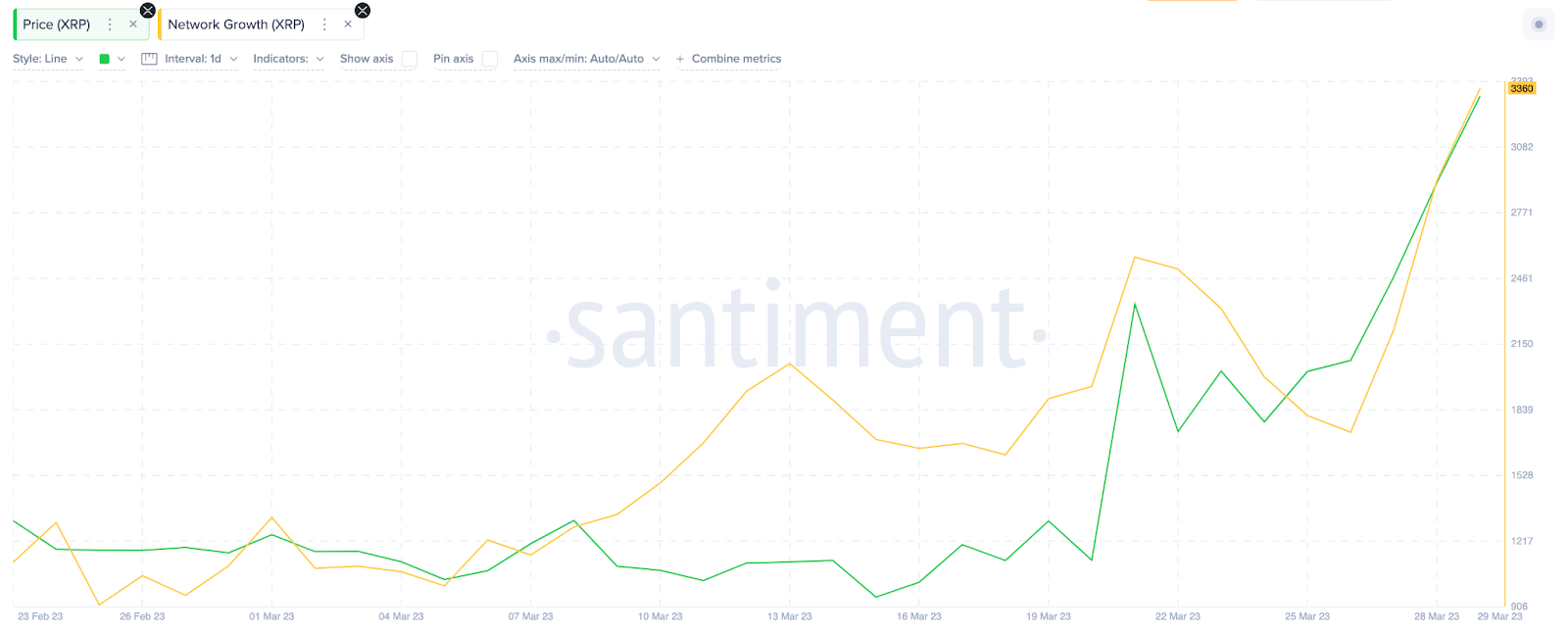 SponsoredComme le montre le graphique ci-dessous, le nombre de nouveaux utilisateurs rejoignant “l’armée XRP” s’est accru de 300 %. Les nouvelles adresses sont passées de 1 006 le 5 mars à 3 360 à la date du 30 mars.