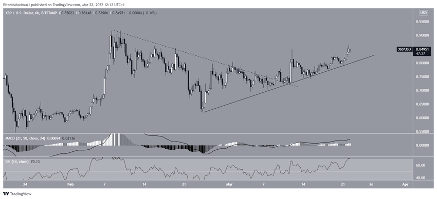 De plus, le graphique sur six heures indique que le XRP a dépassé une ligne de résistance descendante (en pointillés) et suit une ligne de support ascendante à la pente marquée.