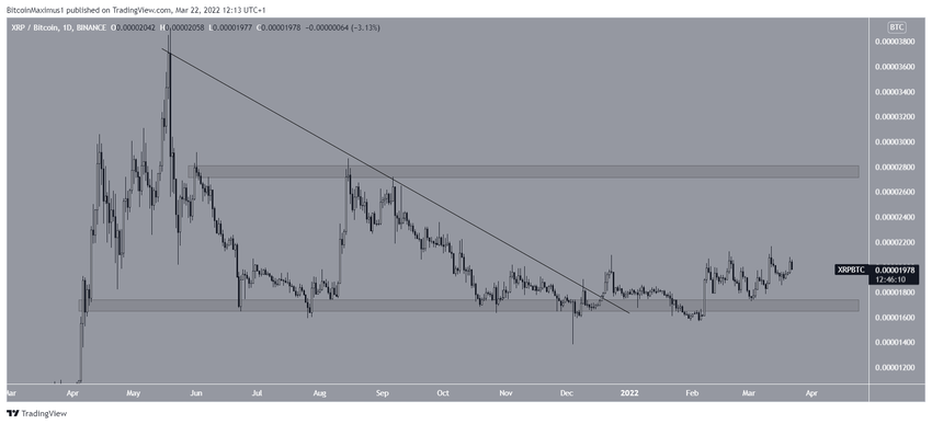 Le graphique de la paire XRP/BTC est également haussier, sachant que le cours a dépassé une ligne de résistance descendante.