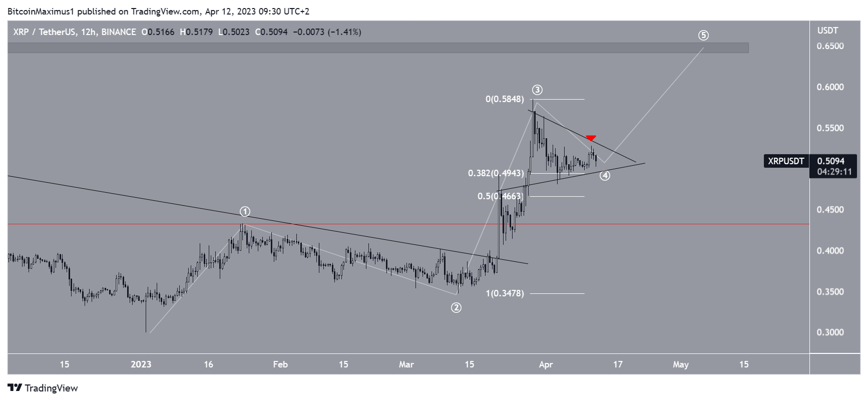 En se penchant un peu plus sur l’historique du cours XRP et sur son décompte de vagues sur 12 heures, il semblerait que l’actif soit actuellement dans la vague quatre d’une hausse en cinq vagues (en blanc). Il s’agit là d’un signal haussier pour le cours futur, indiquant qu’il pourrait dépasser la résistance des 0,525 $ et monter vers 0,650 $.