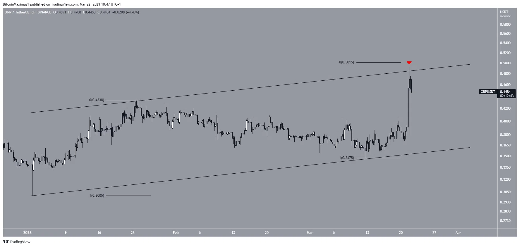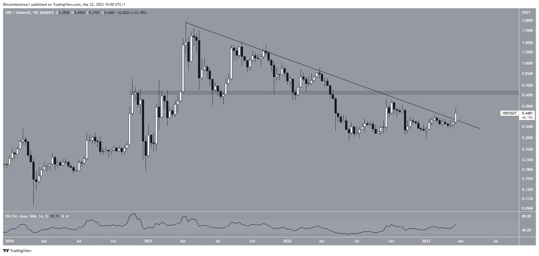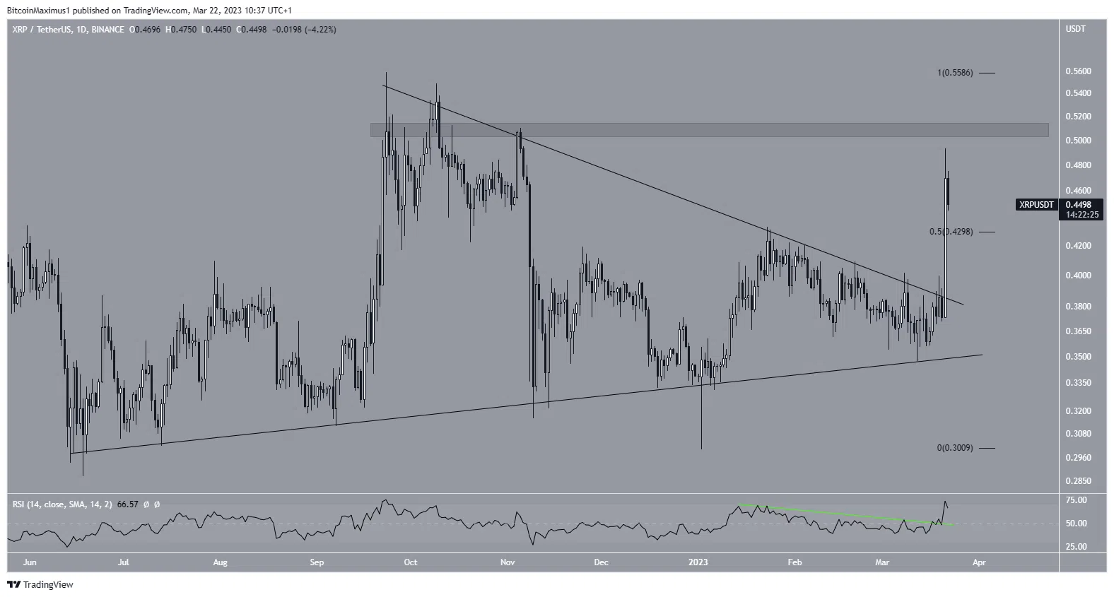 Le cours du XRP évolue au sein d’un triangle symétrique depuis juin 2022. Son schéma de support et de résistance s’est trouvé validé à de nombreuses reprises tout au long de cette période. Le 21 mars, l’actif a finalement dépassé cette figure de triangle et a généré un imposant chandelier au cours des 24 heures suivantes, menant à un nouveau sommet annuel de 0,49 $.