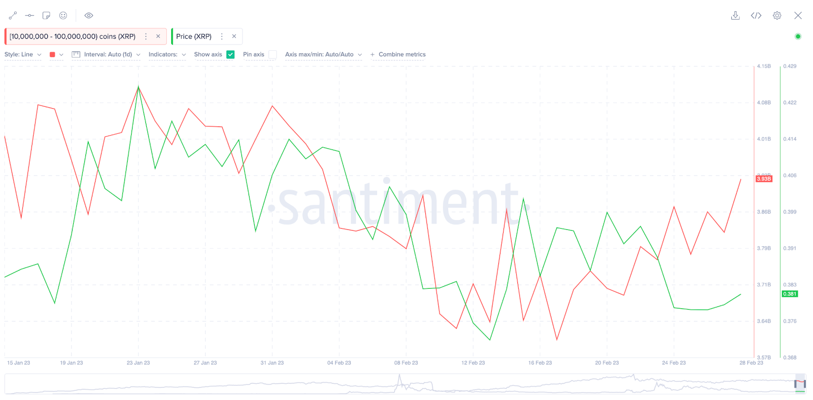SponsoredCela confirme là encore une tendance haussière pour le XRP. En effet, il y a une corrélation positive entre le cours de l’actif et le schéma historique d’achat/vente des baleines détenant de “10 à 100 millions” de jetons.