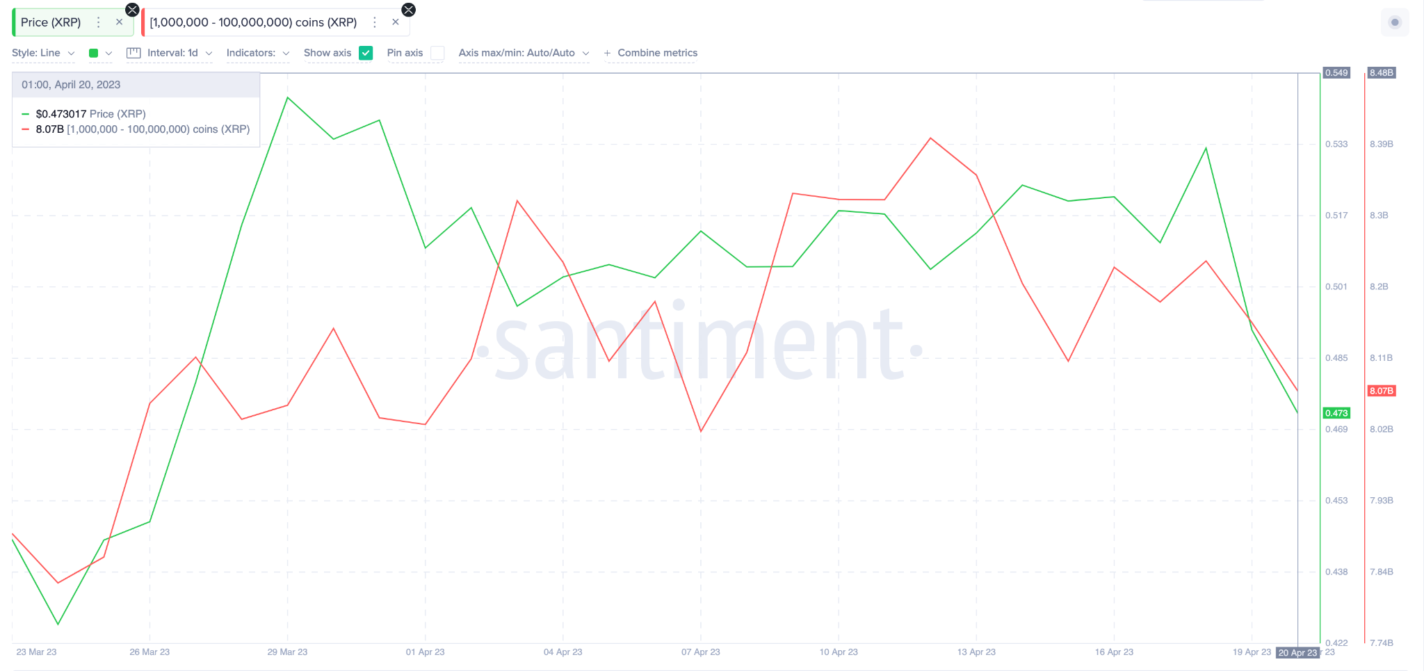 En effet, les données on-chain de Santiment nous montrent que ce groupe de baleines a conservé des soldes cumulés de portefeuilles supérieurs à 8 milliards de pièces XRP depuis la fin du mois de mars.