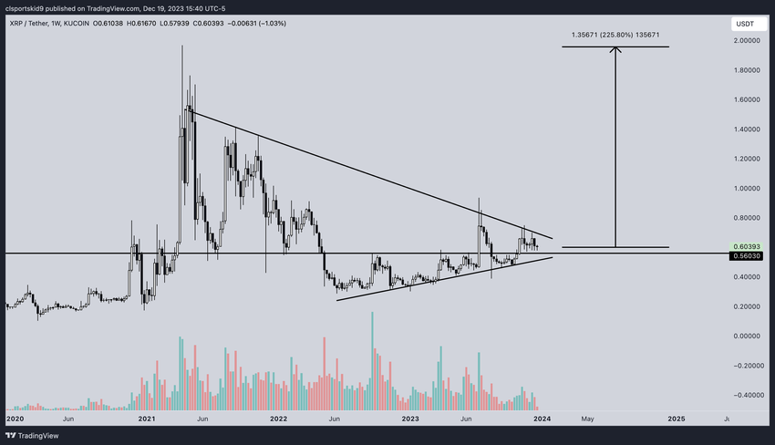 L’analyse technique du cadre de temps hebdomadaire montre que le cours du XRP s’est négocié au-dessus d’une ligne de tendance de soutien ascendante depuis mai 2022.