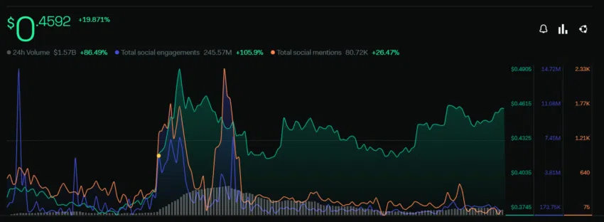 Selon Lunar Crash, le volume social de XRP a atteint 5 967, tandis que ses participations sociales ont été de 14,9 millions au cours des dernières 24 heures. Sa performance hebdomadaire a également montré une croissance de son engagement social de 105,9 %, pour atteindre 245,57 millions, et ses mentions ont augmenté de 26,4 % pour atteindre 80 720.