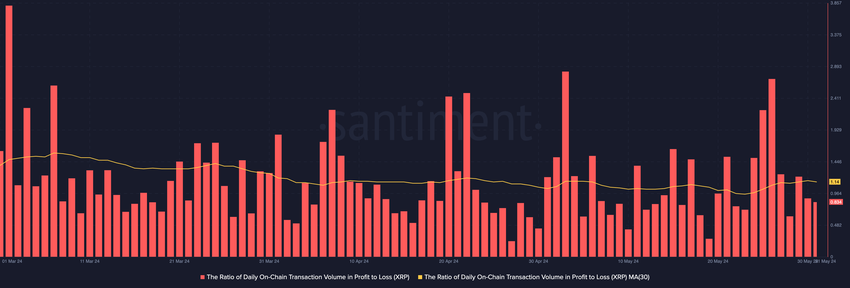 Ces détenteurs de XRP ont peut-être rempli leurs sacs en raison des transactions de cet altcoin au cours des dernières semaines. En effet, une évaluation du ratio quotidien du volume de transactions de XRP en profit par rapport aux pertes a donné une valeur de 1,14.