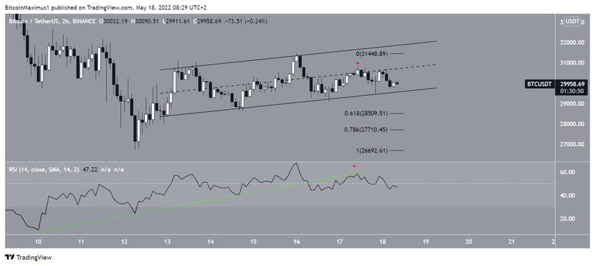 Bitcoin est en déclin depuis son passage du 5 mai sous un canal parallèle ascendant. Il est jusque-là descendu jusqu’à un creux de 26 700 $, ce le 12 mai.