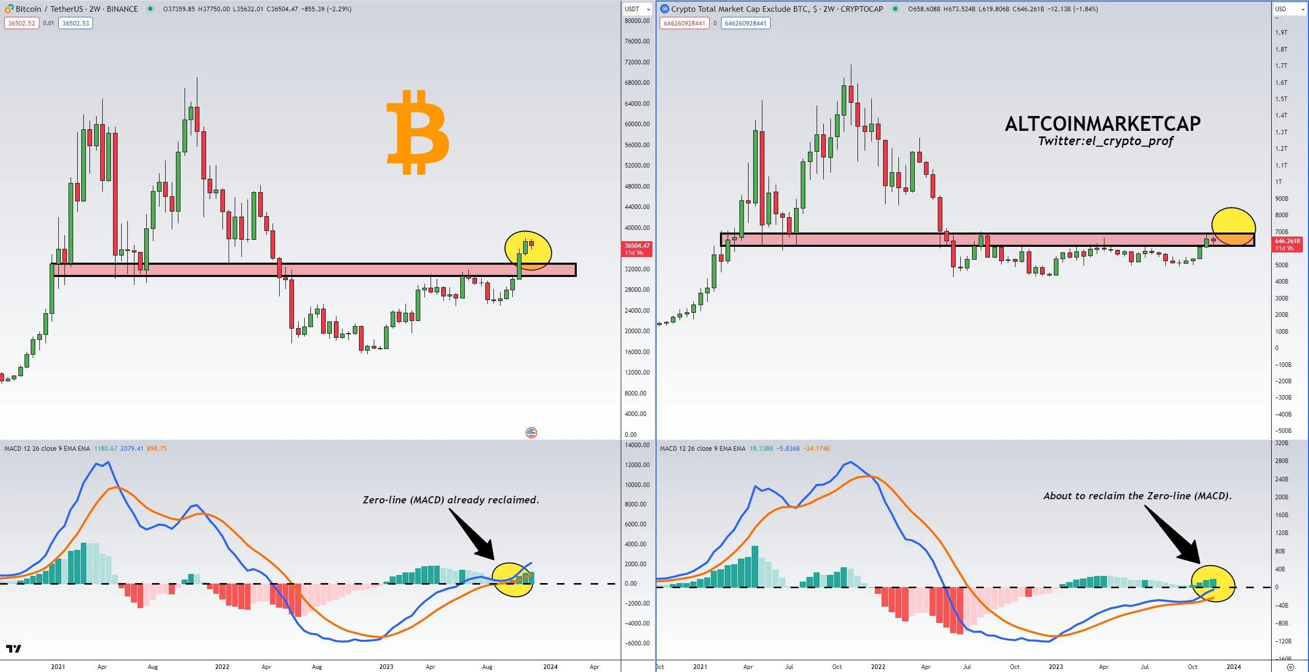 D’après l’analyste, la MACD de la capitalisation du marché du marché des altcoins est sur le point de franchir la ligne zéro. Pour rappel, la MACD est un indicateur de momentum qui permet d’évaluer la relation entre deux moyennes mobiles exponentielles.