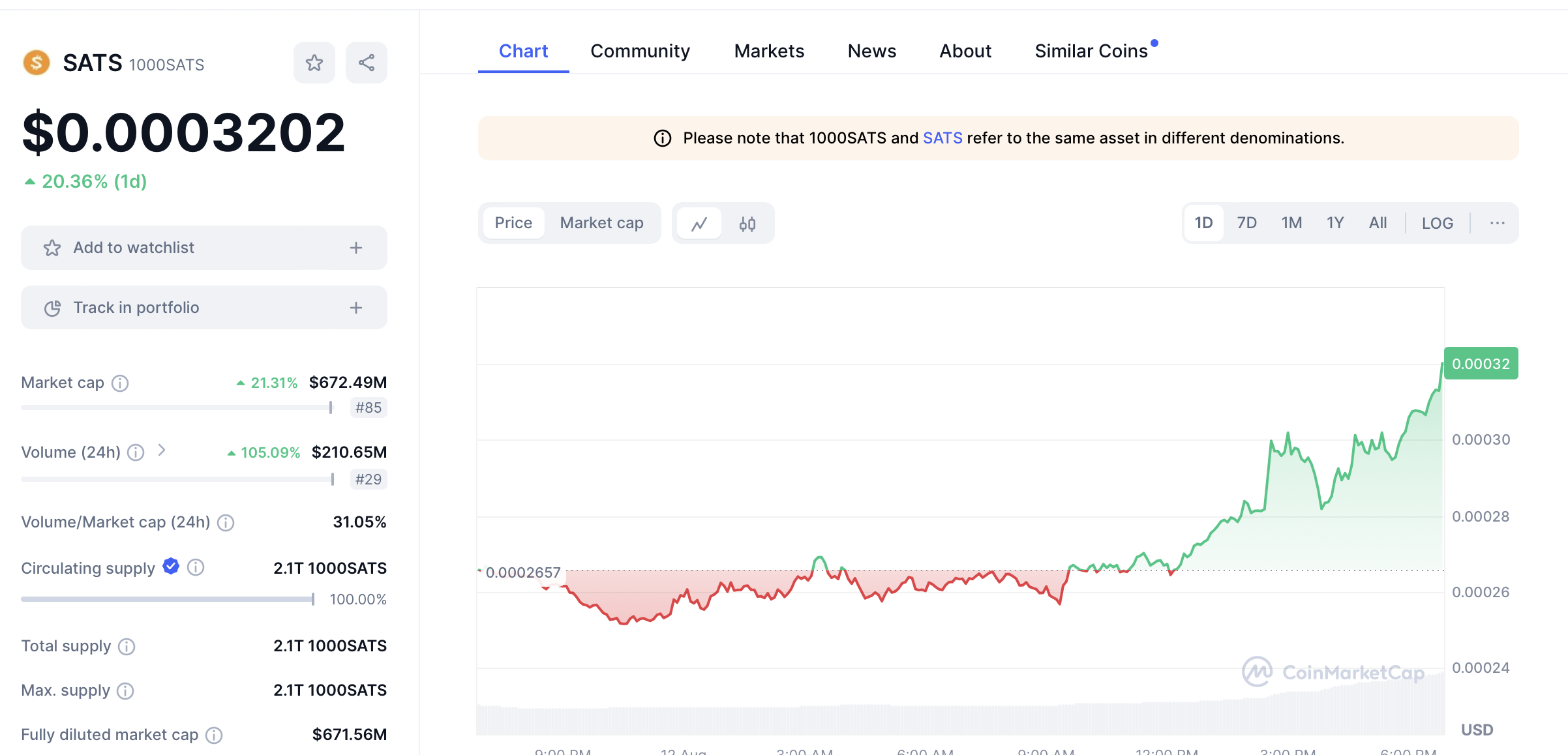 SponsoredDepuis son creux du 5 juillet, la crypto semble reprendre le contrôle. Son cours a progressé de 183 %, avec une hausse remarquée ces derniers jours. Après le crash du “Lundi Noir,” le cours de SATS a déjà augmenté de 51,41 %. Malgré une consolidation relative aujourd’hui, la valeur de la crypto a encore progressé, cette fois-ci de 18,35 %.