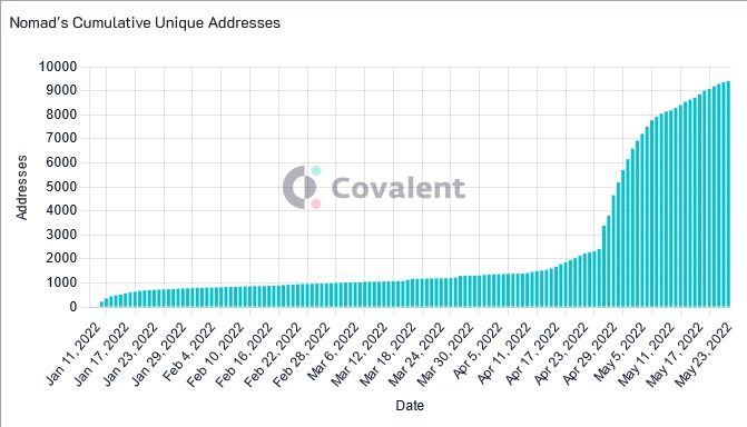 Depuis le début du mois en cours, 5 000 nouvelles adresses ont été créées sur Nomad. Il s’agit ici d’une croissance exponentielle, étant donné que Nomad a mis trois mois pour atteindre 3 000 adresses uniques. On peut donc en conclure que les promesses de sécurité de la plateforme attirent de nombreux utilisateurs de ponts crypto.