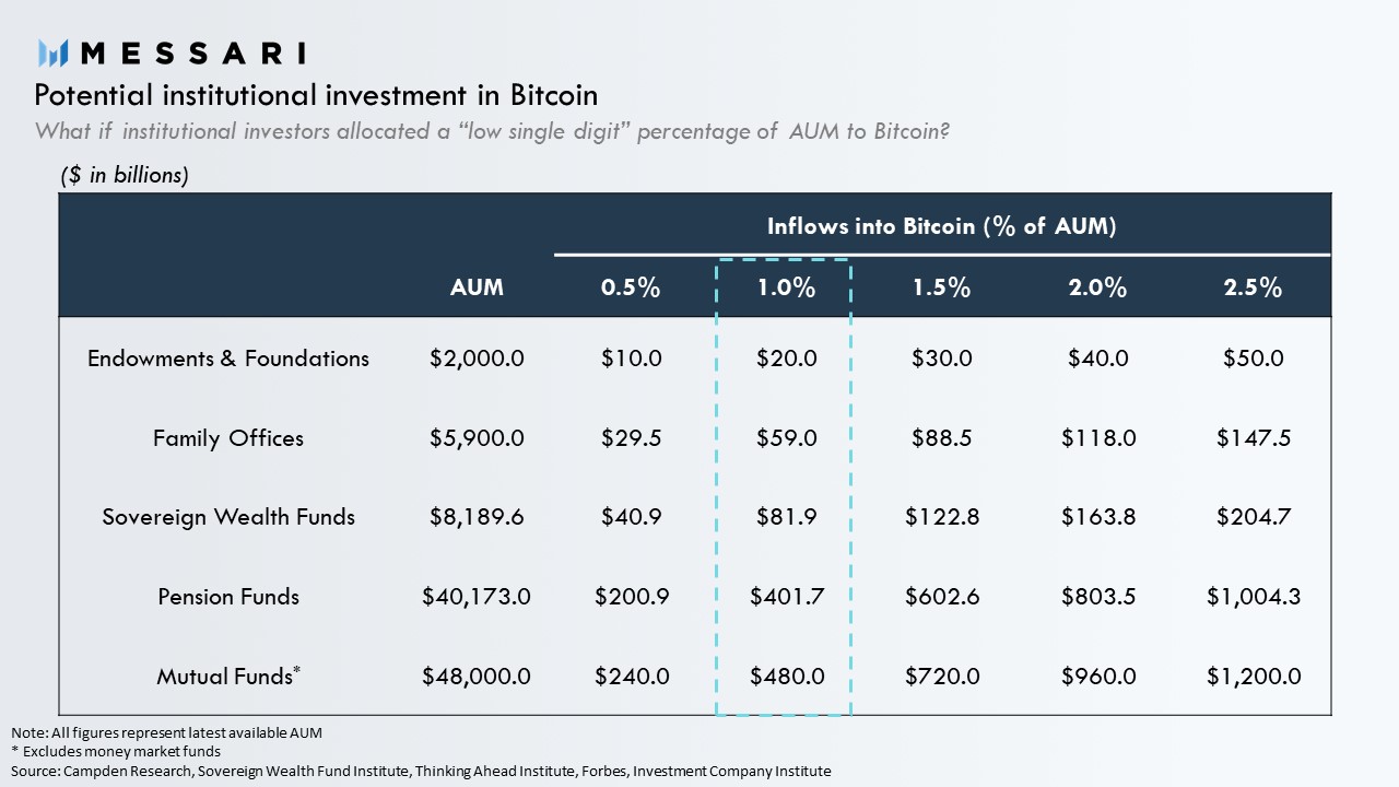 La société de recherche basée à New York, Messari, a publié un nouveau rapport explorant la possibilité de rediriger seulement 1% de tout l’argent institutionnel des actifs traditionnels vers le Bitcoin.