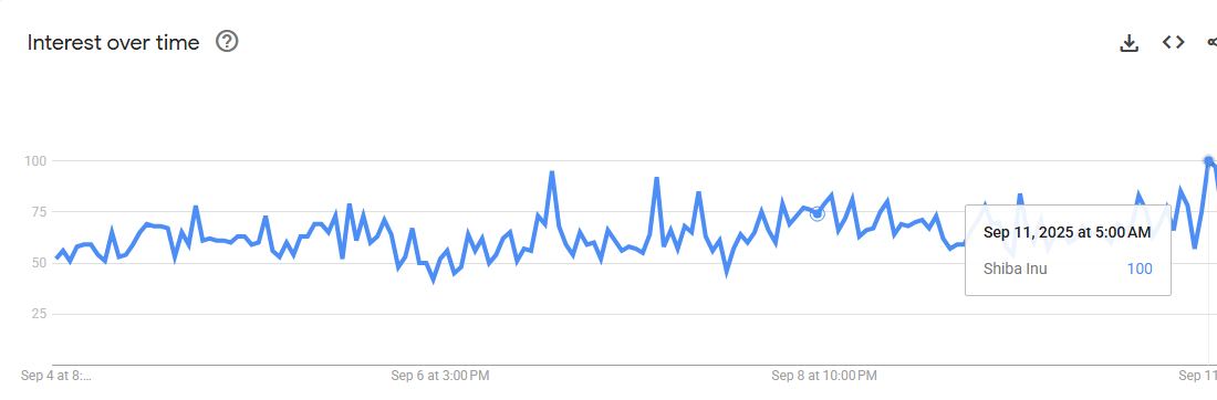 Les données Google Trends confirment un regain d’attention du public pour Shiba Inu. Les recherches ont atteint un score de 100 la semaine dernière, reflétant un intérêt maximal. Ce type de tendance s’est déjà montré annonciateur de rebonds importants par le passé.